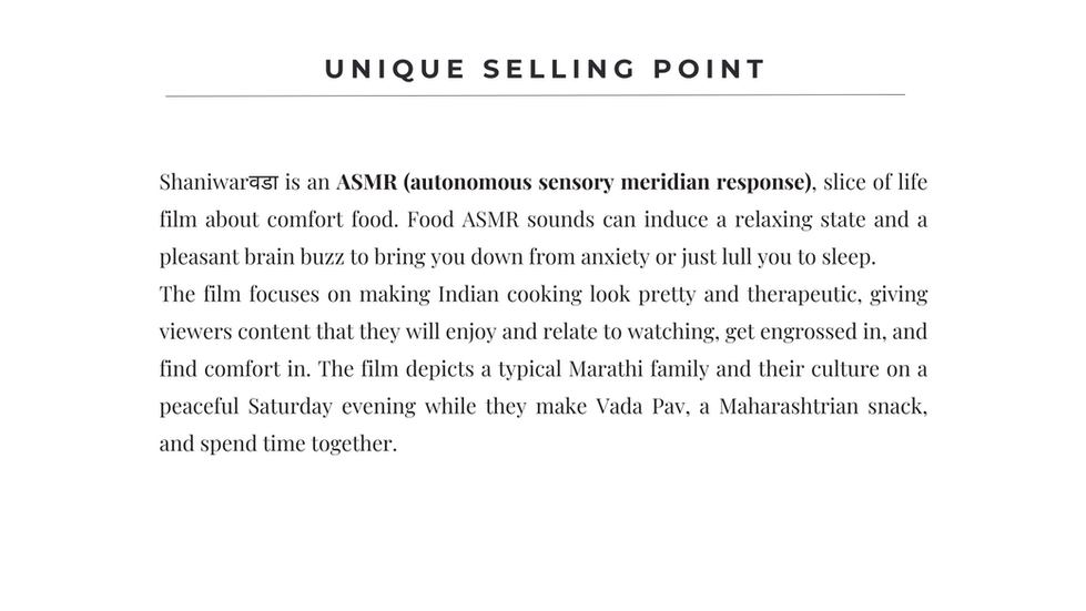 Shaniwar वडा (Shaniwar Vada) is a slice-of-life film about comfort food. The film focuses on making Indian cooking look pretty and therapeutic, giving viewers content that they will enjoy and relate watching to, get engrossed in, and find comfort in.